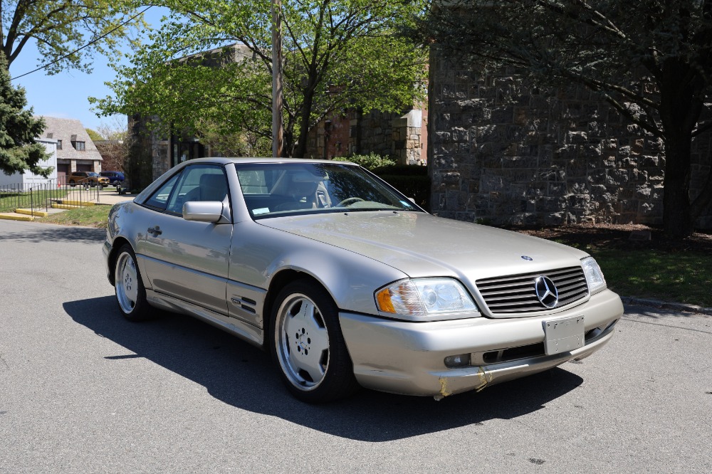 This 1998 Mercedes-Benz 500SL is an excellent driver with 109k miles. Metallic champagne with beige leather interior and factory hard-top. It runs and drives great but would benefit from minor cosmetics. These cars are known for their superb build quality and bulletproof reliability and this car still feels very strong and solid out on the road. The Carfax report shows a minor accident reported in 2011 and there are a few blemishes on the front bumper as well the body in a few areas. The wheels are also a bit scuffed up and the interior would benefit from a good detailing. These cars represent an excellent value in the collector car market.