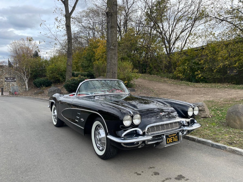 This beautiful 1961 Chevrolet Corvette is a very attractive driver with a 4-speed manual and two tops. Black with red interior. 283 V8 with 270hp linked to a 4-speed manual gearbox. A black-plate California car that runs, drives, shifts, and stops very well. The white convertible top is also in good condition and all gauges work as they should. There are some scratches and chips over the front end, hood, and rear deck. Very presentable and clean interior. Owner?s Guide and some other booklets are included in the sale. Very clean and solid underside and frame. An honest and straight car overall. A very desirable year for the C1 Corvette. This highly collectible American icon is not to be missed.